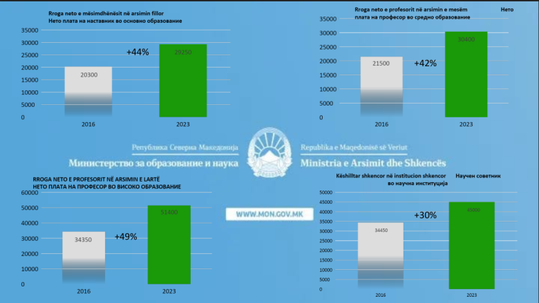 Kështu që, paga neto e mësimdhënësi në arsimin fillor në vitin 2016 ishte 20.300 denarë, ndërsa në vitin 2023 është 29.250 denarë, përkatësisht rritja është për 44%. Paga e profesorit në arsimin e mesëm ishte 21.500 denarë, ndërsa tani paga neto është rritur për 42%, gjegjësisht tani është 30.400 denarë.